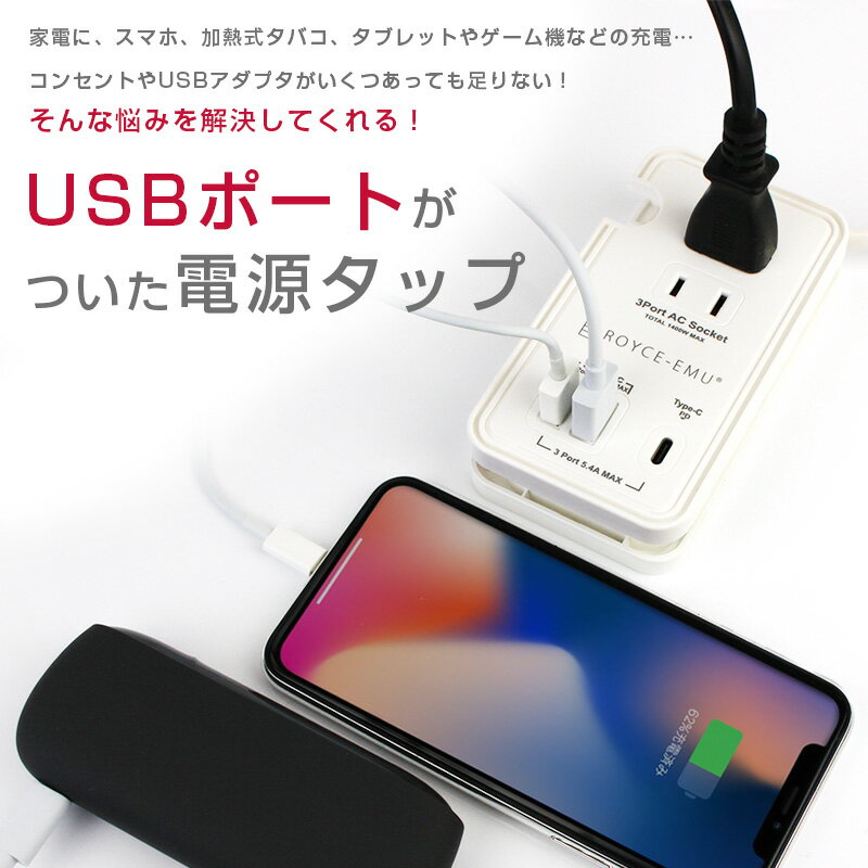 【検索ワード】 電源タップ アダプター コンセント 延長コード たこ足 タコ足コンセント USB Type-C typeC タイプC type-A 2ポート 3ポート 2口 3口 スマホ スマートフォン 充電器 充電コンセント USBアダプタ USBコンセント 急速充電 高速充電 PD USB パワーデリバリー スマートIC USB Power Delivery iPhone android アイフォン タブレット商品説明 家電やスマホなど充電機器が多い方やご家族が多くコンセントが足らない方必見のアイテム!USBポート付きの電源タップです。