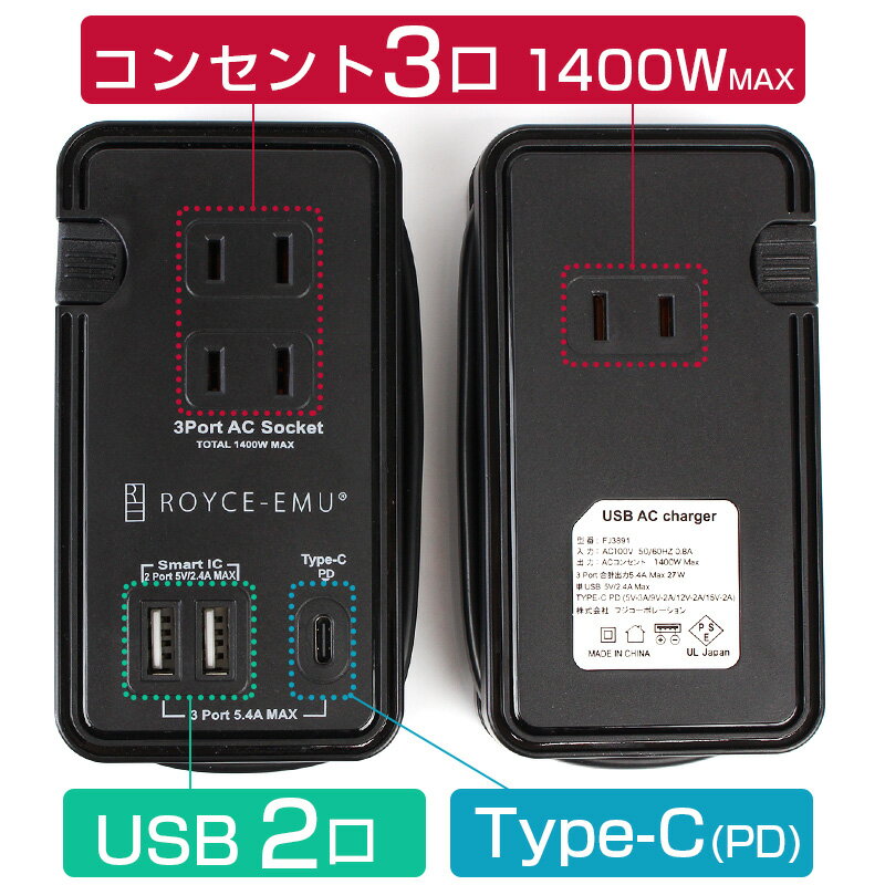 コンパクト設計でご自宅での設置にもピッタリ!! サイズ 約 縦 12 cm × 横 6.5cm × 厚み 2.6 cm 電源プラグケーブル長さ 約 24cm(プラグ部分除く) 重さ 約 163g ポート数 コンセント×3口 / USB Type-A ×2口 / USB Type-C(PD対応)×1口 入力 AC100V 50/60Hz 0.8A 出力 ACコンセント : 1400W Max 3Port USB : 合計出力 5.4A Max 27W 2Port USB(Type-A) : 5V/2.4A MAX Type-C PD : 5V-3A/9V-2A/12V-2A/15V-2A その他 PSE認証品 ご注意 Type-Cポートでの高速充電は充電機器、接続ケーブル両方ともPD対応機器をご使用ください。